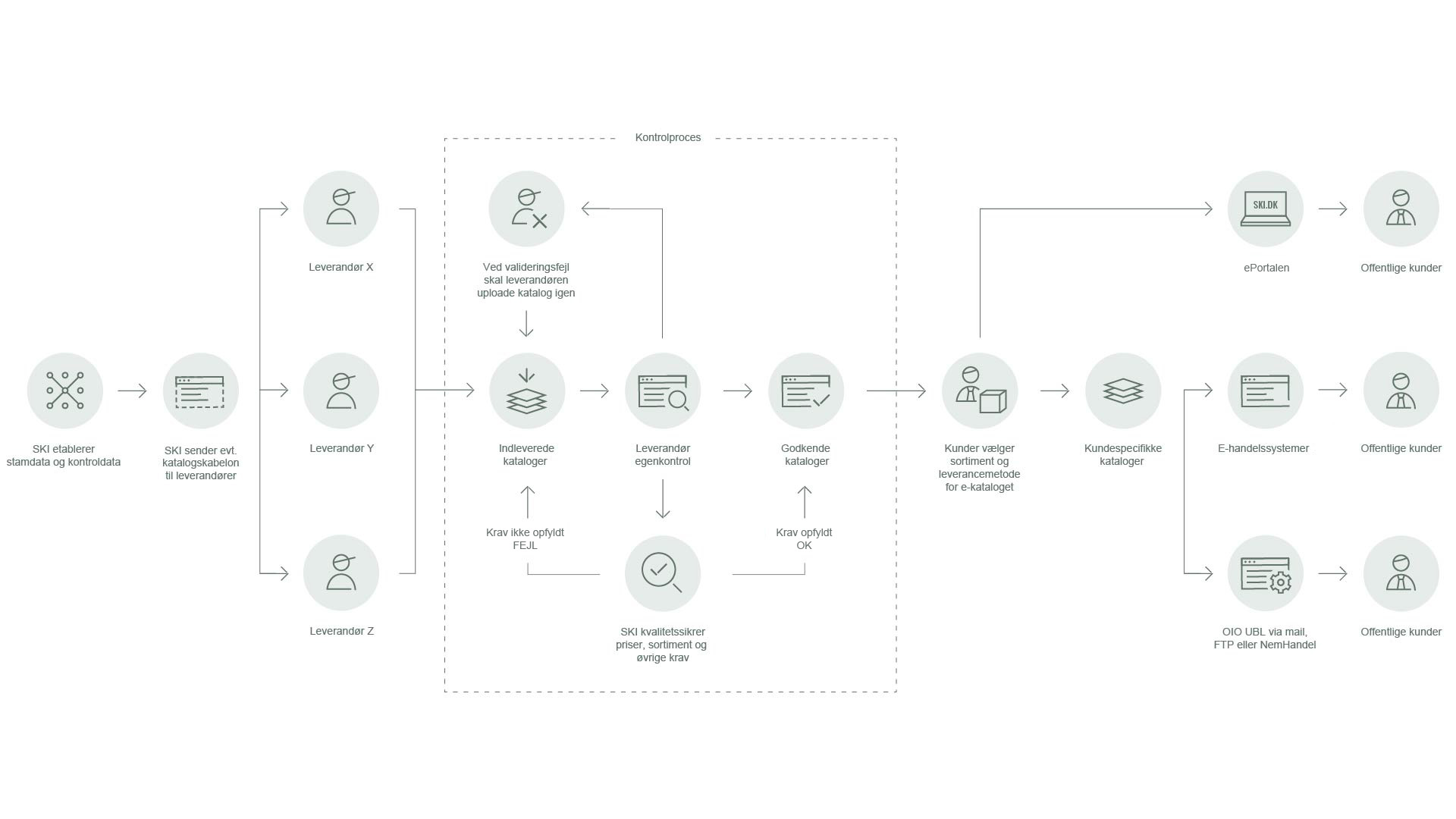 SKI fungerer som motor for e-katalogerne og sørger for, at e-katalogerne når fra leverandørerne og ud til hver enkelt kunde. E-katalogerne skal igennem en række trin, før de bliver kvalitetsgodkendt, så vi sikrer, at de er korrekte og brugervenlige. Det betyder, at vi modtager e-katalogerne fra jer som leverandører efter jeres egenkontrol og kvalitetstjekker materialet, inden vi offentliggør e-katalogerne og gør dem tilgængelige på ePortalen.