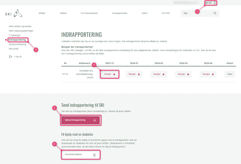 - Under 'Indrapportering' kan du se de seneste indrapporteringer for hver af dine aftaler. Tryk på mangler ud for den aftale og den pågældende måned, du ønsker at indrapportere for, for at uploade den udfyldte skabelon.