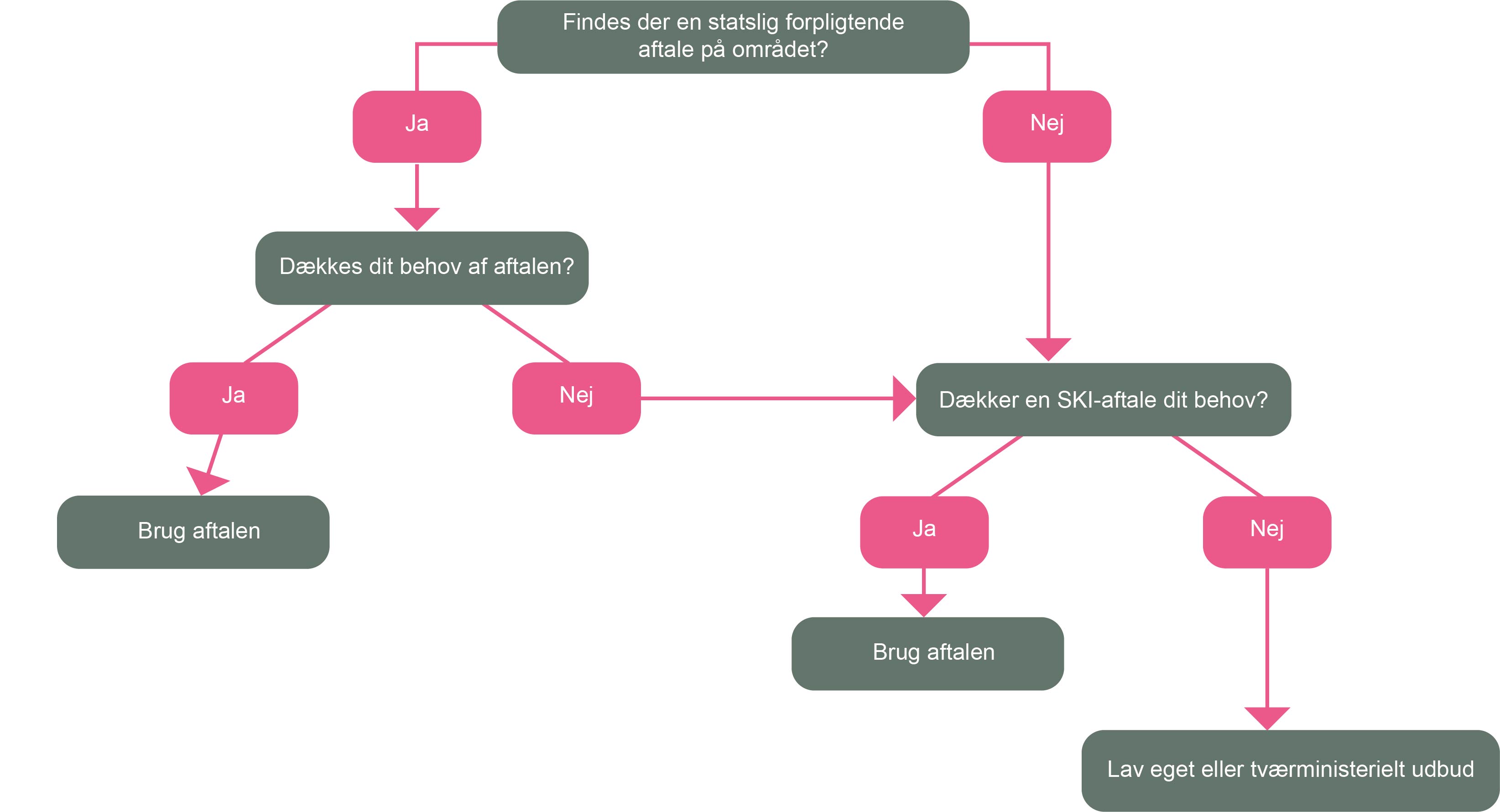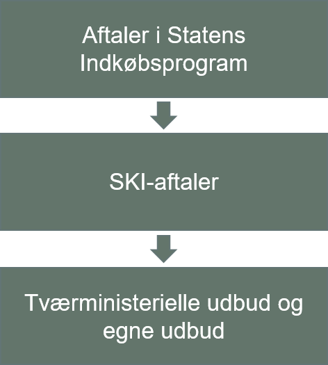 Ministerier, styrelser og statslige institutioner er via cirkulæret for indkøb i staten forpligtede til at anvende aftalerne i Statens Indkøbsprogram. Det betyder, at de altid først skal undersøge, om de kan få dækket deres indkøbsbehov via en aftale i Statens Indkøbsprogram. Hvis det ikke er muligt, skal de anvende SKI’s aftaler, hvor de kan dække behovet. Kun hvis dette undtagelsesvis ikke er muligt, kan de udarbejde deres egne aftaler eller gennemføre fælles udbud.